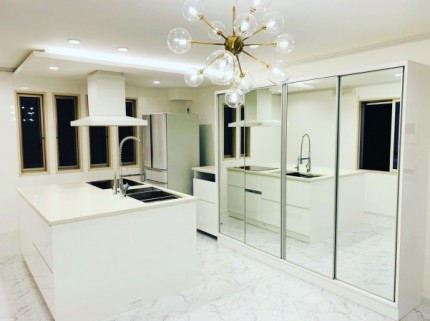 以前は窓側の壁にキッチンがあり、奥様は家族に背中を向けて料理をしていました。キッチンの位置をダイニング側へ設ける新しい暮らし方を見据え、リビングの内装や照明をリフォームすることとなりました。キッチンを移動するには、・給排水の移動・レンジフードのダクトをどのように収めるか(綺麗に隠す)・照明、コンセントやスイッチの移動など、細々としたことのも移動も必要となります。