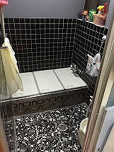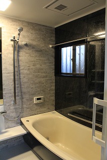 システムバスサイズ寸法に合わせるために、浴室の大きさを若干広げました。それ以上に 広々した印象になるのは、浴槽の位置を右手にし、洗い場が目の前に広がったように見えるからでしょうか。以前のタイル張りの床と比べ、床の足触りがヒヤッとしなくなったのも 嬉しいポイントです^^