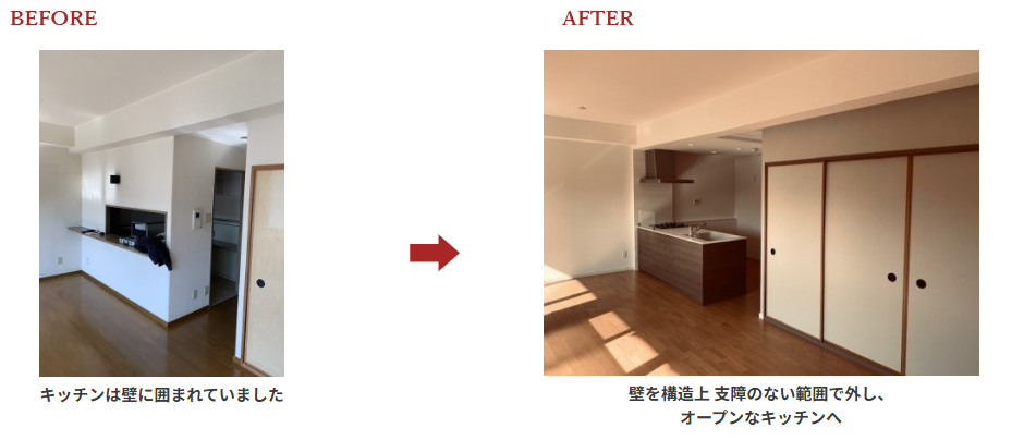 キッチンを囲む壁を外しただけでなく、空間をコーディネートして綺麗に見せる、広く見せるアイディアが詰め込まれています。