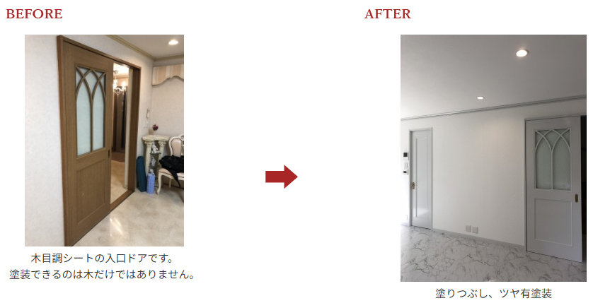 愛知県豊明市の戸建て住宅にて、リビングを中心とした内装リフォームを行いました。 床や壁の色に合わせて、室内ドアもコーディネートを希望。 ドアは本体ごと取替えることもできますが、塗装の方がコスト面では抑えることができます。 室内ドア、窓枠、クローゼット扉、巾木など、内部塗装が可能です。 ご相談ください。