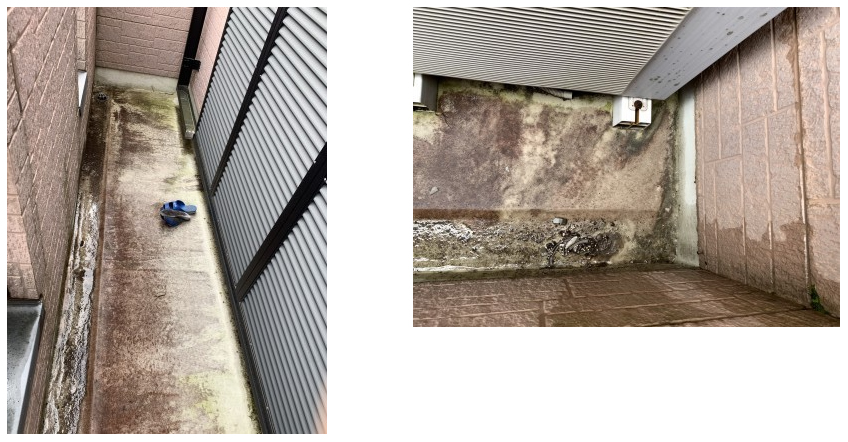 当初は防水処理をされた床でグレー色をしていたと思うのですが、ご覧の通りに防水塗膜の剥離と汚れが目立ちます。