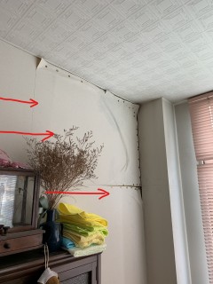 ベランダの床から劣化した防水シートの切れ目を通って家の内側へと入り込み、ベランダ側に近い部屋の壁にまで到達したと考えました。