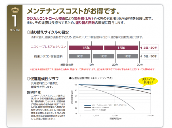 従来のシリコン樹脂塗料に比べて、塗り替え回数を減らすことができます。