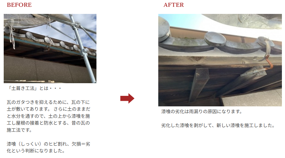 数十年前に建築された家屋ですと、瓦は「土葺き工法」で施工されています。