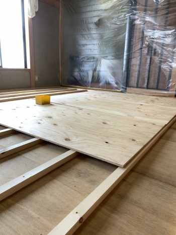 厚みの違いを埋めるために、フローリングの下に材木を組みます。